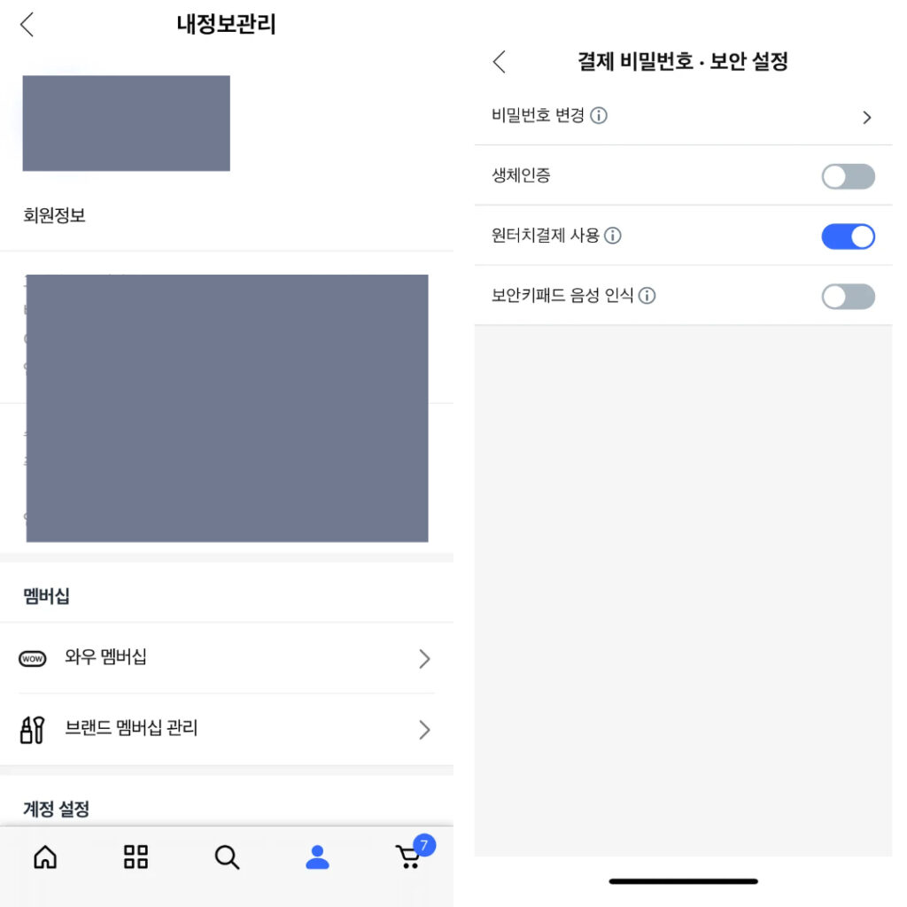 두번째 체크리스트로는 사람모양 클릭 후 회원정보로 들어가게되면 ‘내정보관리’가 있습니다. 해당 칸에 들어가서 비밀번호 변경 및 원터치 결제 사용을 비활성화 해주면 됩니다.