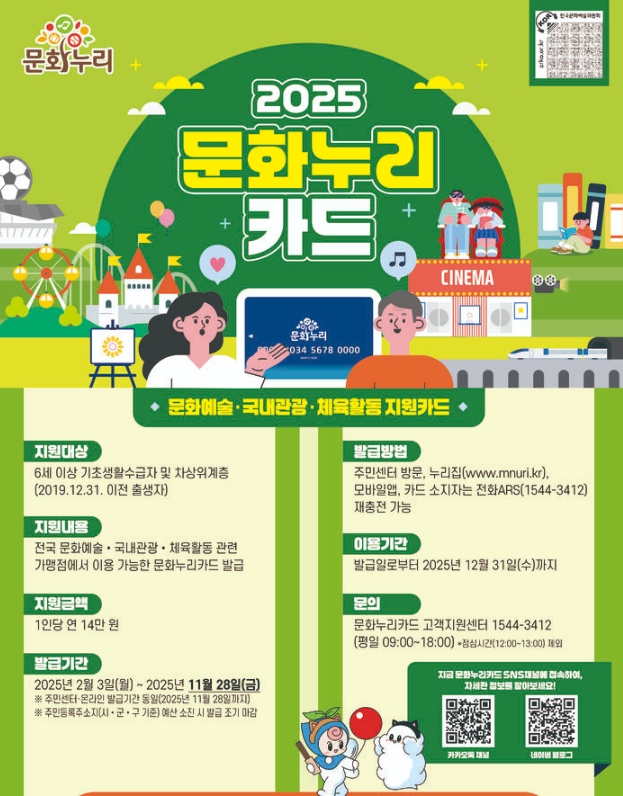문화누리카드란? 사회적/경제적 취약계층에게 문화·여행·체육 활동을 정부가 제공하는 연간 지원금 카드입니다. (문화체육관광부·한국문화예술위원회)에서 제공해요. 쉽게 정리하자면 저소득층이 문화활동을 할 수 있도록 국가가 일정 금액을 넣어주는 카드입니다.